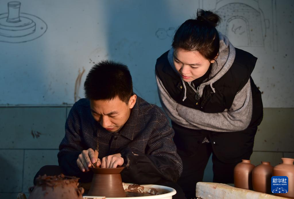 10月22日,吕继成(左)在向徒弟演示陶器制作。 新华社记者王全超摄