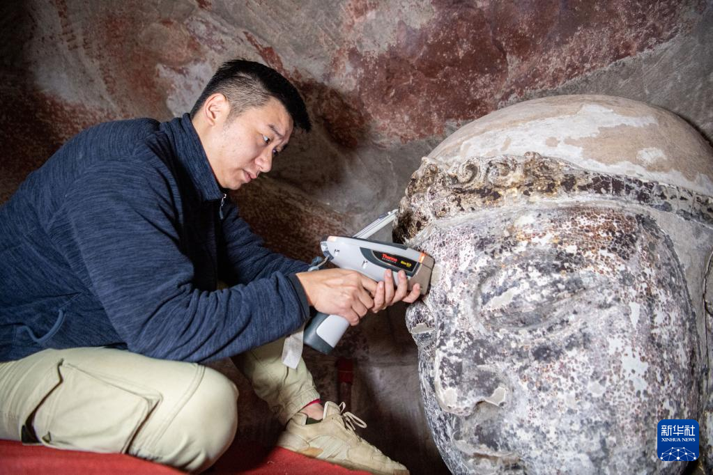 11月12日,修缮工程现场技术员寻执政(左)、邵明贵在对造像进行表面弹性波检测。新华社记者 唐奕 摄