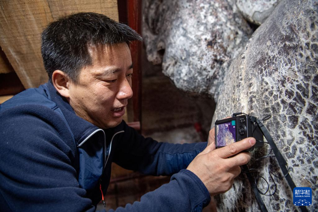 11月12日,修缮工程现场负责人张俊杰在拍摄造像显微照片。新华社记者 唐奕 摄