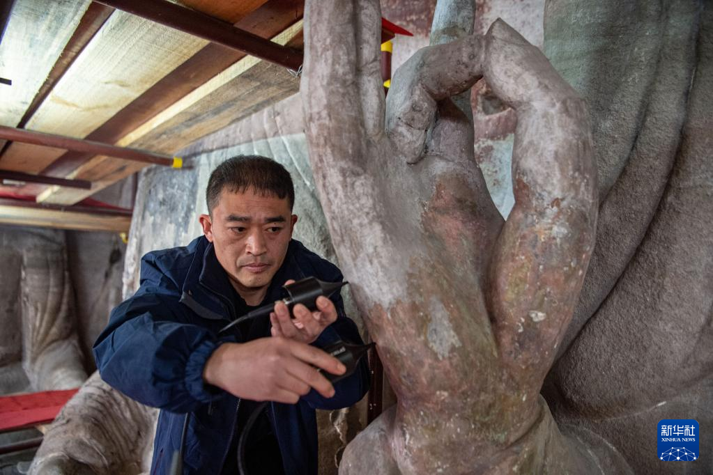 11月12日,修缮工程现场负责人张俊杰在为造像表面除尘。新华社记者 唐奕 摄