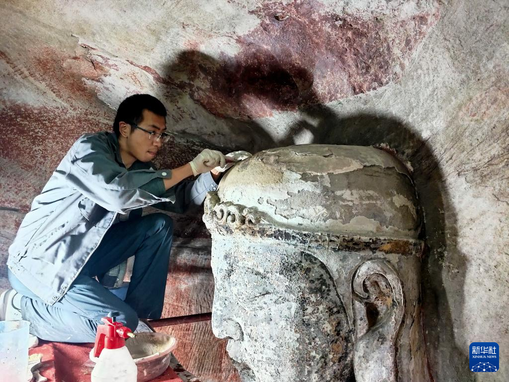 修复技师刘健在对造像残缺部位进行补型(2020年11月3日摄)。位于重庆市南岸区长江岸边的弹子石摩崖造像开凿于元末明初,迄今已有600多年历史。现存的两组摩崖造像造型精美,是三峡库区规模最大的一处石窟造像。 长久以来,受潮湿环境、气候等因素影响,造像不同程度地出现空鼓、开裂、金箔脱落等问题。2016年,该处文物被国家文物局纳入首批“川渝石窟示范项目”,并由中国文化遗产研究院的修缮团队负责实施修缮。 经过团队长期工作,弹子石摩崖造像修缮工程第一期于2021年10月竣工,并通过初步验收。摩崖造像积尘、微生物病害、裂隙、空鼓、残缺及岩体内部盐害等问题得以基本消除。下一步,修缮团队将实施第二阶段修缮工程,开展造像彩绘、金箔层病害治理,佛龛、题刻修复,以及大佛阁修复等工作。 作为川渝石窟保护项目的示范工程,弹子石摩崖造像修缮工程不仅对文物保护及活化利用工作有着重要意义,也为川渝地区石质文物修缮保护提供了宝贵的实践经验。新华社发(中国文化遗产研究院供图)