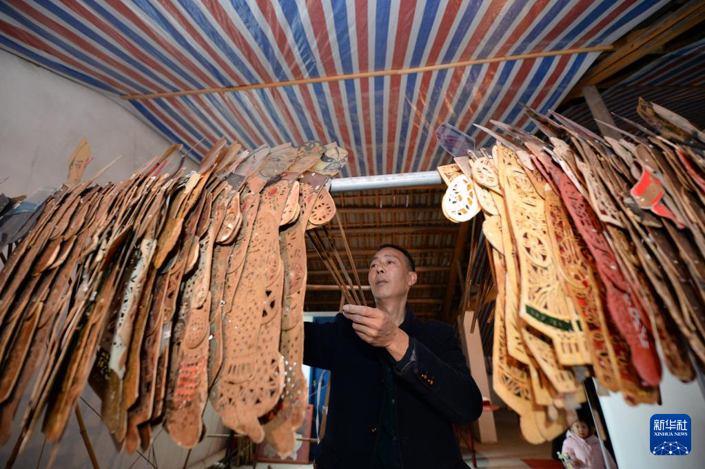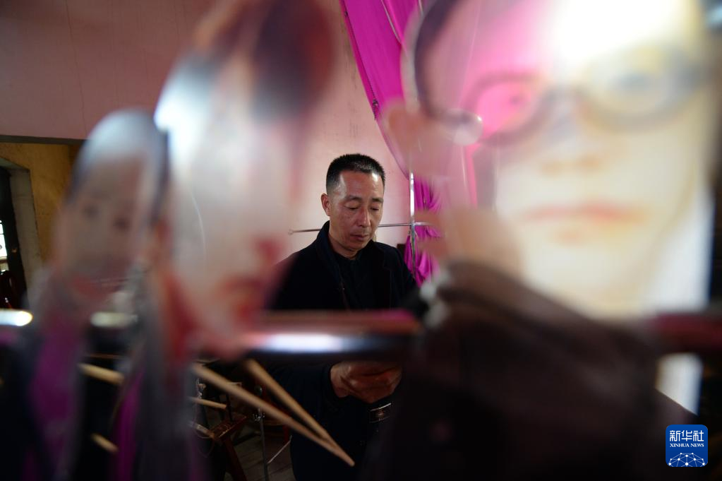11月16日,在位于浏阳市镇头镇跃龙村的家中,宋伟军在挑选将要演出的皮影人物。新华社记者 陈振海 摄
