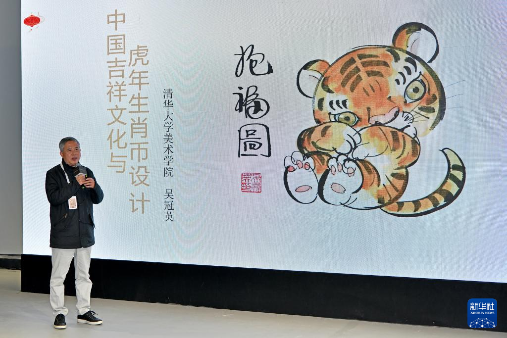 11月18日,2022中国壬寅(虎)年金银纪念币背面图案设计者之一、清华美院教授吴冠英介绍纪念币设计过程。新华社记者 李鑫 摄