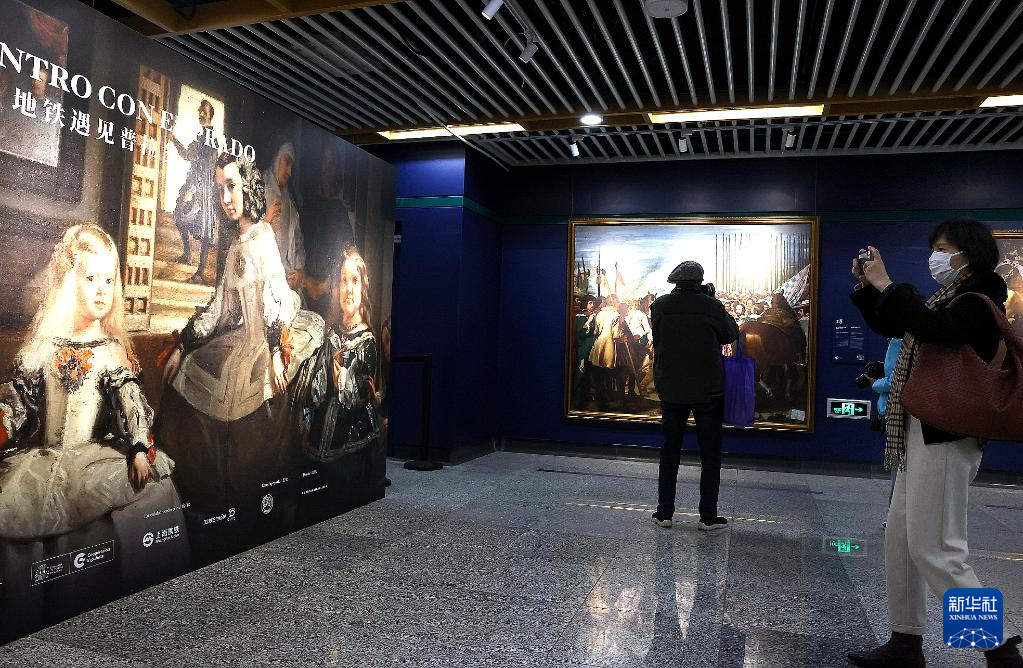 近日,西班牙普拉多国家博物馆部分馆藏画作以原尺幅复制品的形式亮相上海地铁龙华中路站站厅,供过往乘客近距离欣赏。