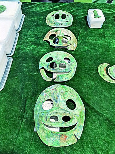 工作台一角,有一柄断戈“吸住”了记者的镜头。把戈弄断后陪葬是当时的一种常见做法,但这只戈的柄端纹饰极为精美,而且是镂空的。如果将戈刃向上,就能看到戈柄处的纹饰,仿佛是几张重合的脸,连眼睛、嘴巴都有,颇有几分“呆萌”气质。同样“萌萌哒”的,还有旁边几只猪脸面具。虽说它们是盾牌上的装饰,但这么可爱的样子,当真是御敌之物么?