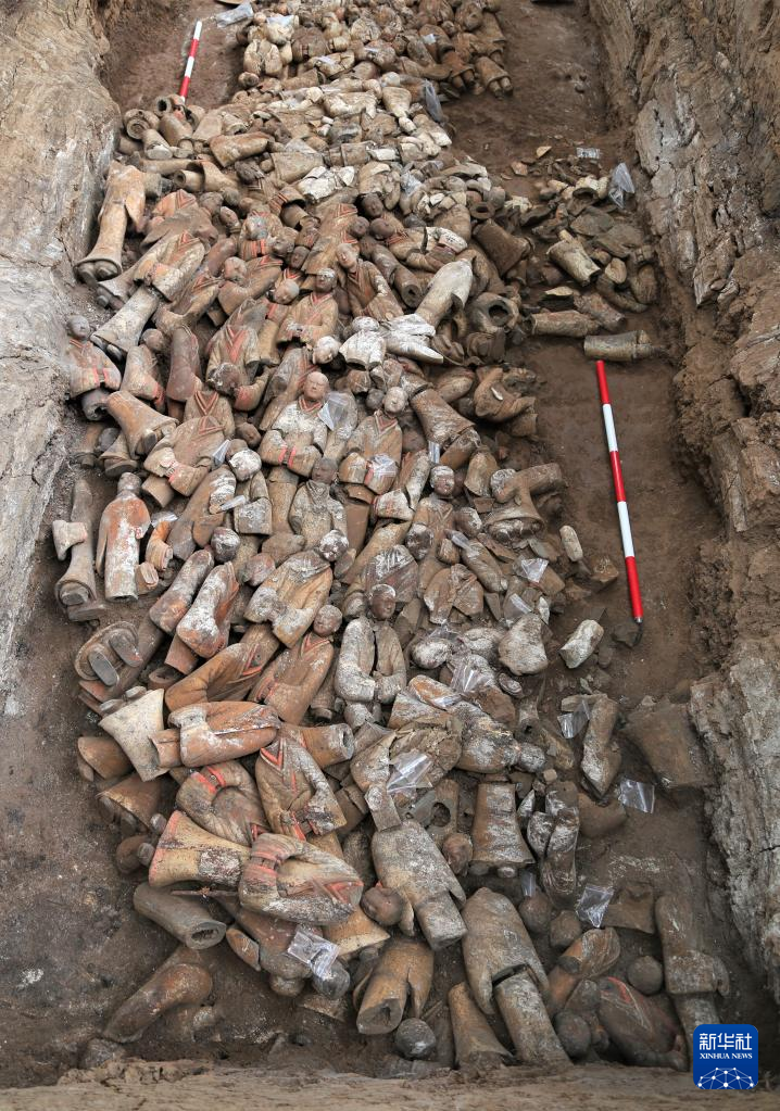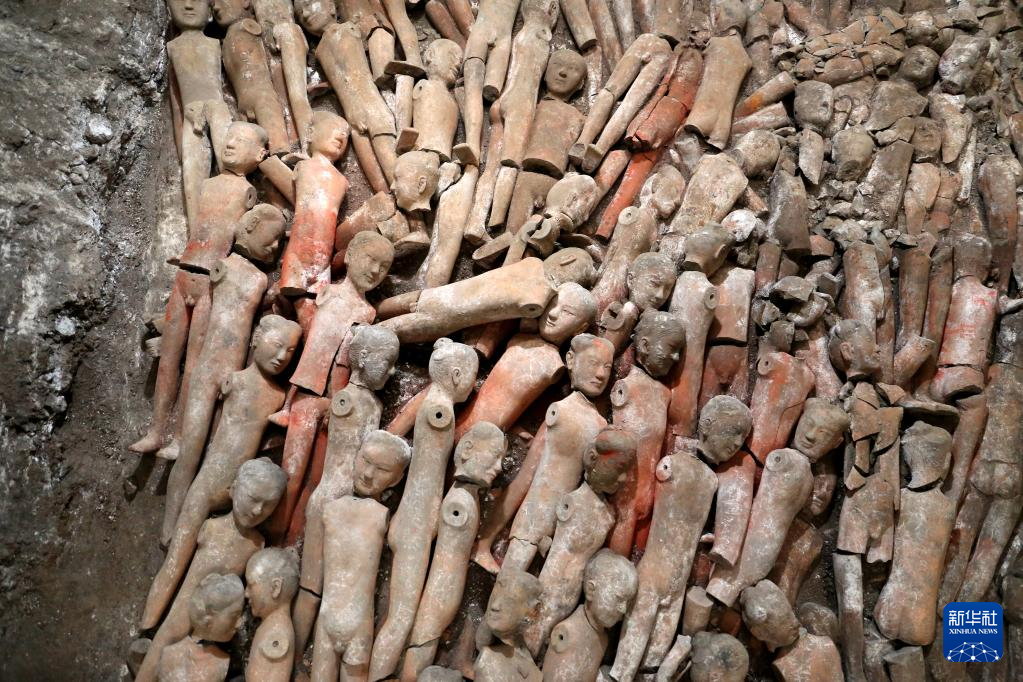 江村大墓外藏坑出土的着衣陶俑(10月8日摄)。新华社发