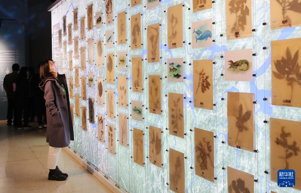 12月14日,参观者在“大江与文明”展区内的长江植物标本展板前驻足观看。