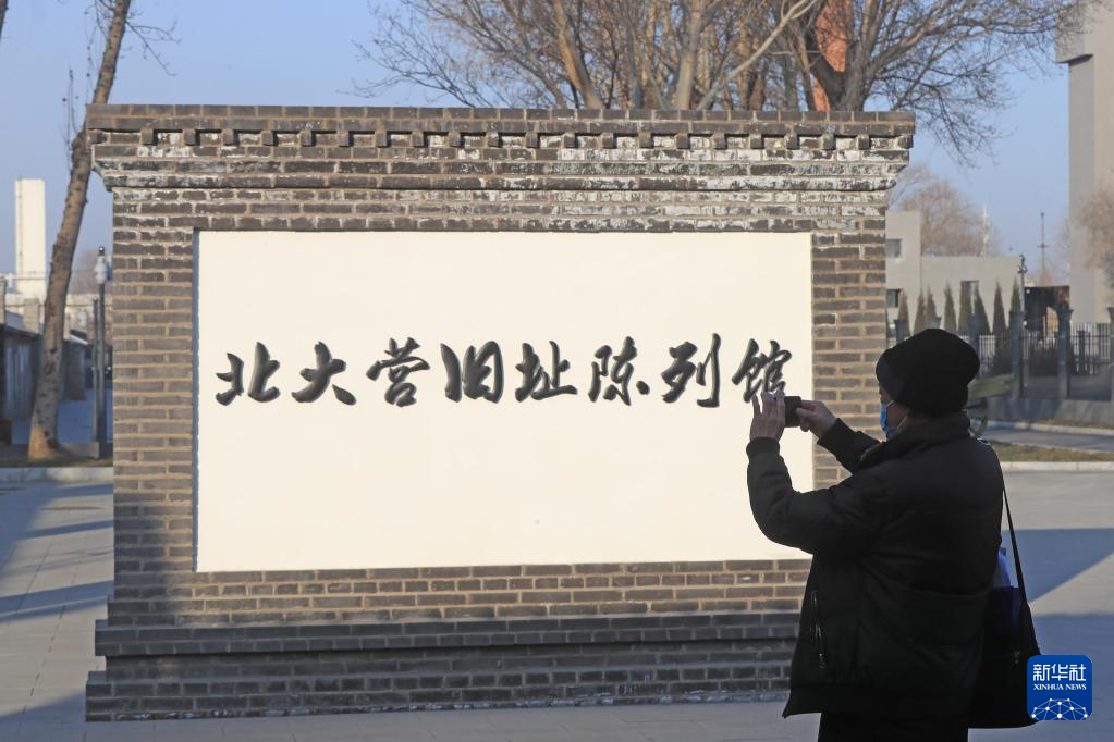 12月23日,观众在北大营旧址陈列馆前拍照留念。