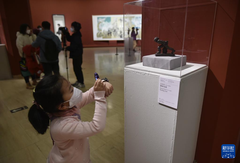 1月7日,小朋友在中国美术馆参观展出作品《溜冰女孩》。