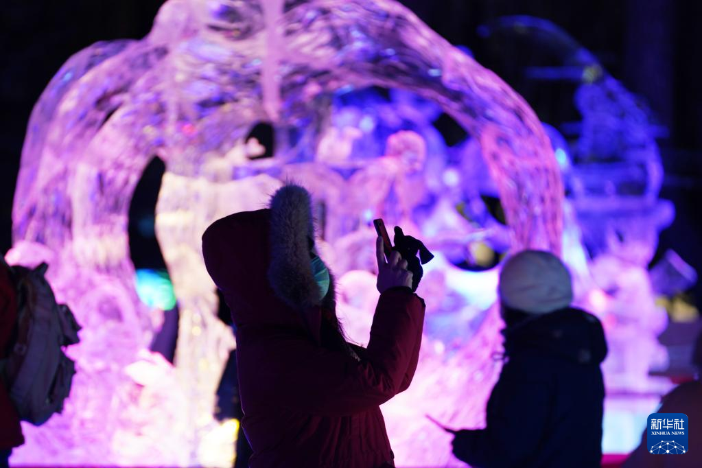 1月8日,游客在哈尔滨冰灯艺术游园会园区拍摄冰雕作品。新华社记者 王建威 摄