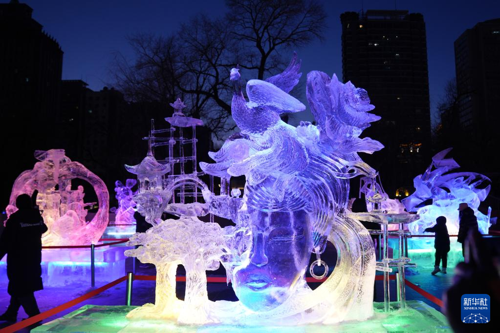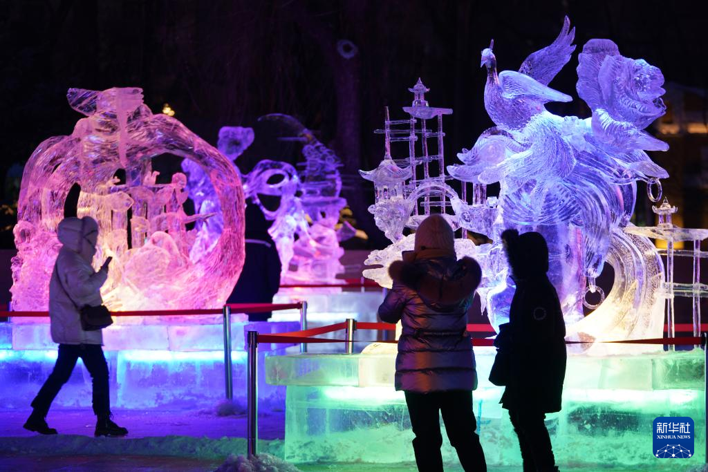 进入冰雪季以来,哈尔滨冰灯艺术游园会园区内举办了多场冰雕赛事。夜色之下,冰雕艺术作品流光溢彩,吸引众多游客前来观赏。