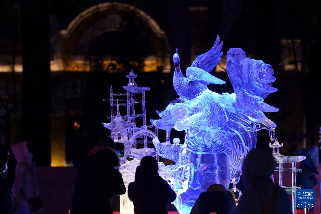 1月8日,游客在哈尔滨冰灯艺术游园会园区欣赏冰雕作品。新华社记者 王建威 摄