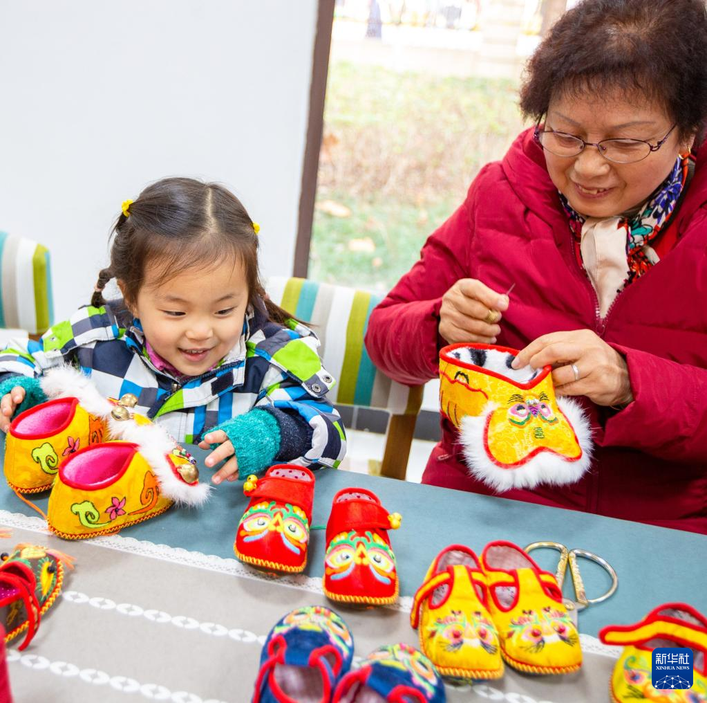 1月18日,江苏省南通市崇川区和平桥街道百花苑社区邻里中心内,居民在缝制虎头鞋。新华社发(翟慧勇摄)