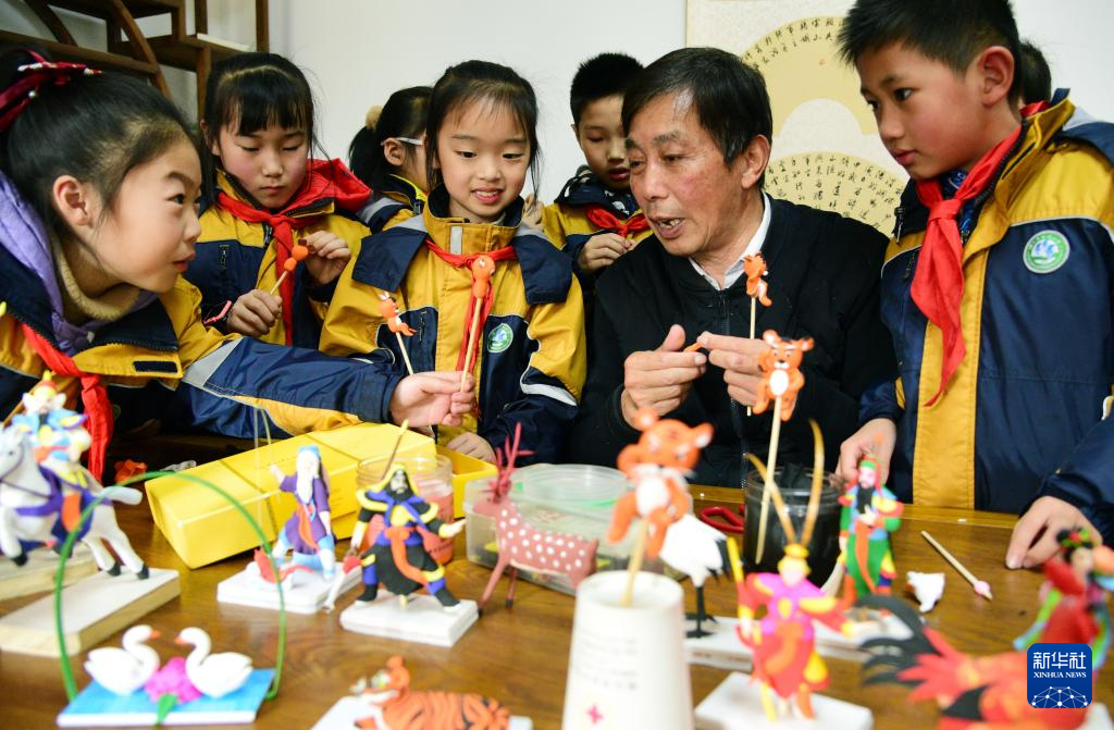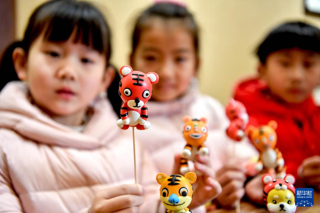 1月18日,在江苏省镇江市西津古渡社区,面塑艺人指导镇江市实验小学的学生制作面塑作品“生肖虎”。新华社发(石玉成摄)
