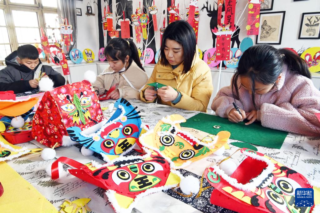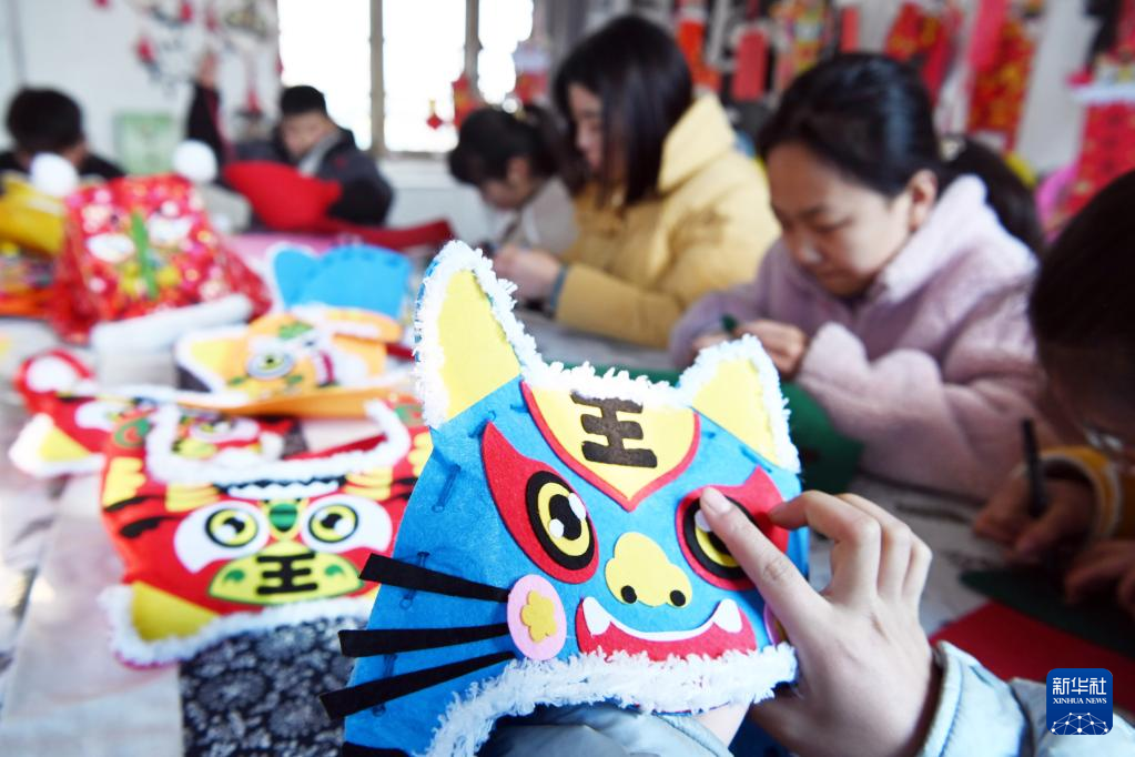 1月18日,河南省沁阳市崇义镇中心小学“童趣美术坊”的师生在做虎头帽。新华社发(杨帆摄)