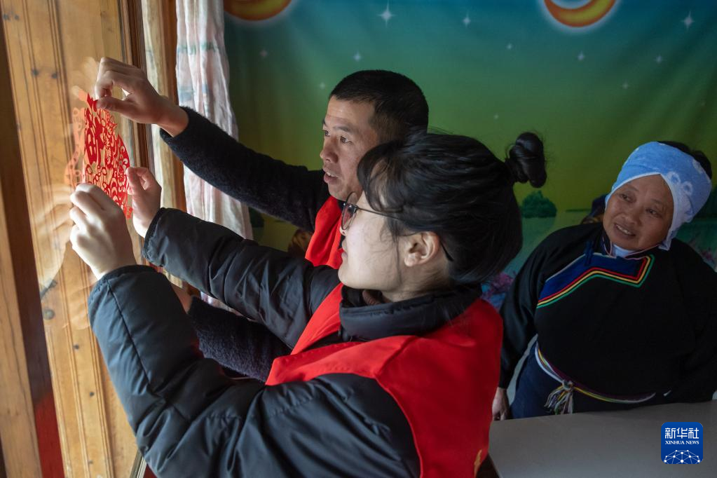 1月19日,在浙江省丽水市景宁畲族自治县郑坑乡吴村,青年志愿者为蓝岳梅老人张贴福字。新华社发(李肃人 摄)