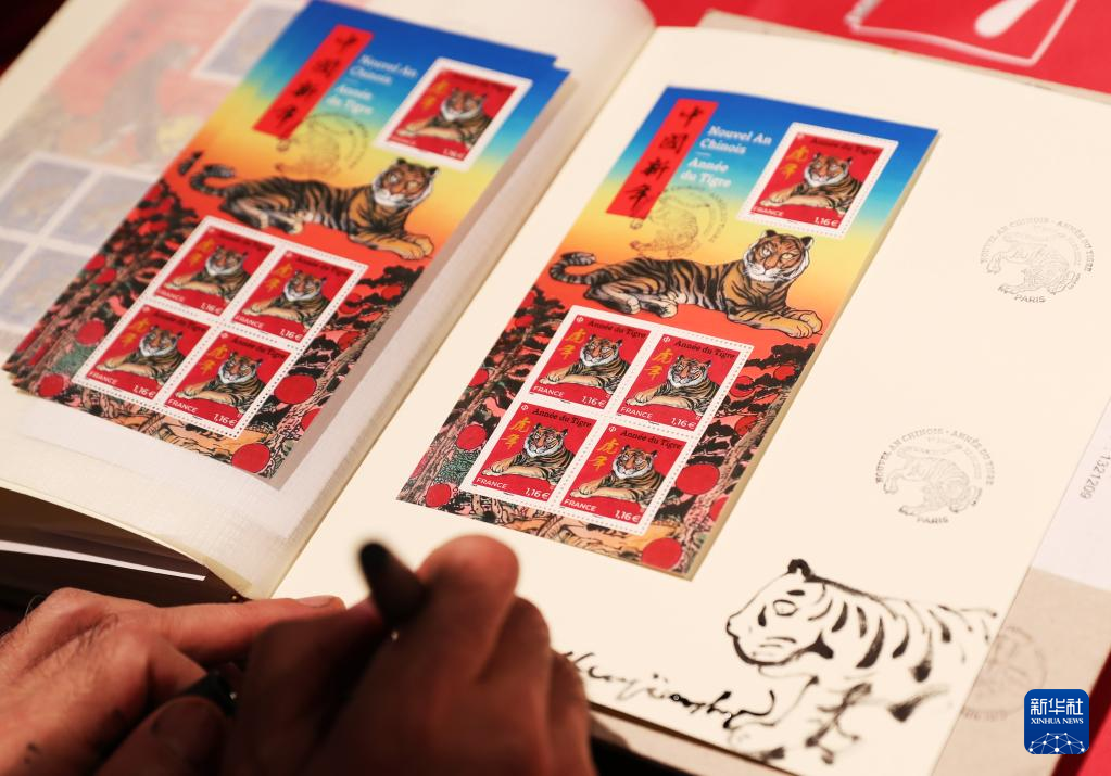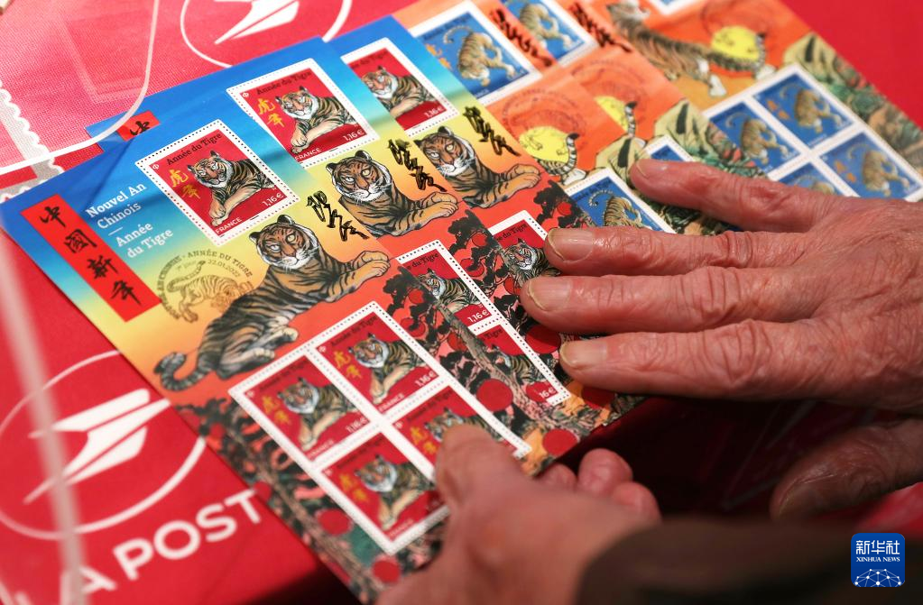 为迎接中国农历新年,法国邮政公司22日在巴黎举行中国农历虎年生肖纪念邮票发行仪式。此次发行的中国农历虎年生肖纪念邮票共两款,由法国华人艺术家陈江洪设计。其中一款面值1.16欧元,票面是红色背景下威严静坐的老虎,象征力量;另一款面值1.65欧元,票面是蓝色背景下伫立远眺的老虎,象征希望。两款邮票的票面上方和下方分别用法文和中文书写“虎年”字样。