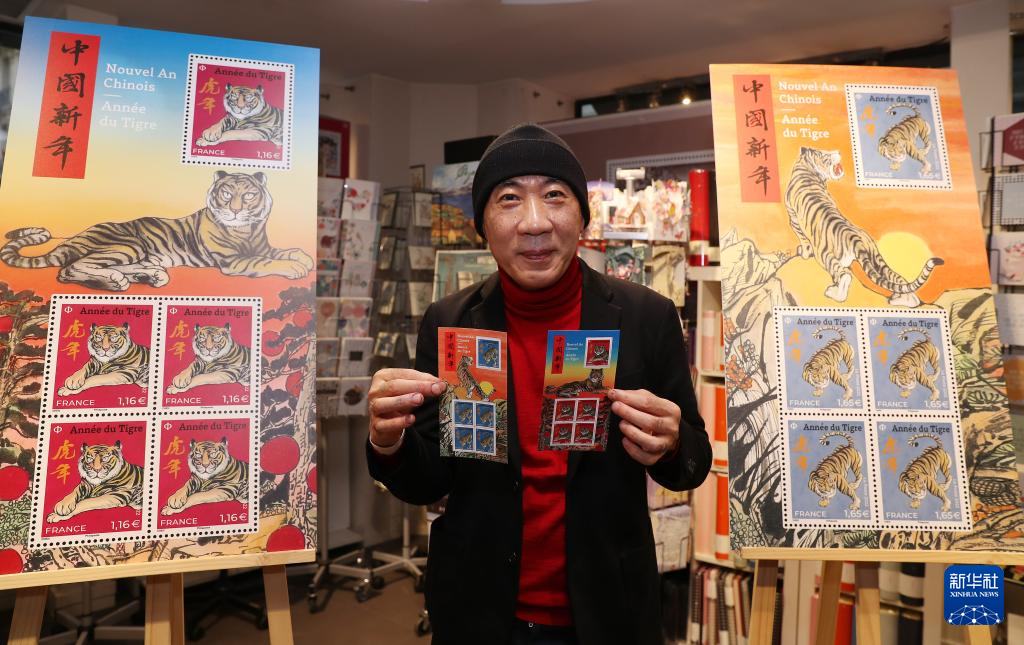 1月22日,一名集邮爱好者在法国巴黎展示其购买的虎年生肖纪念邮票。 新华社记者 高静 摄