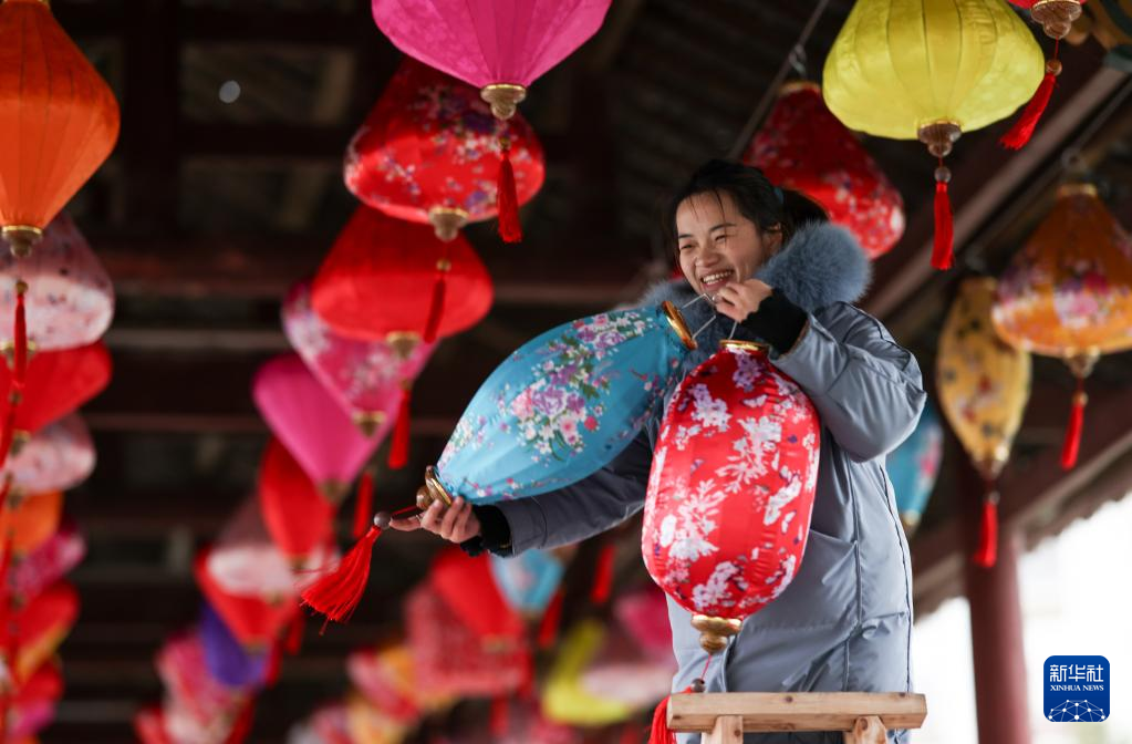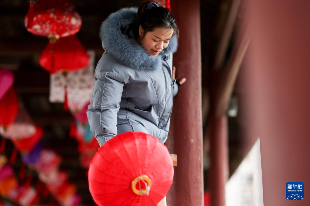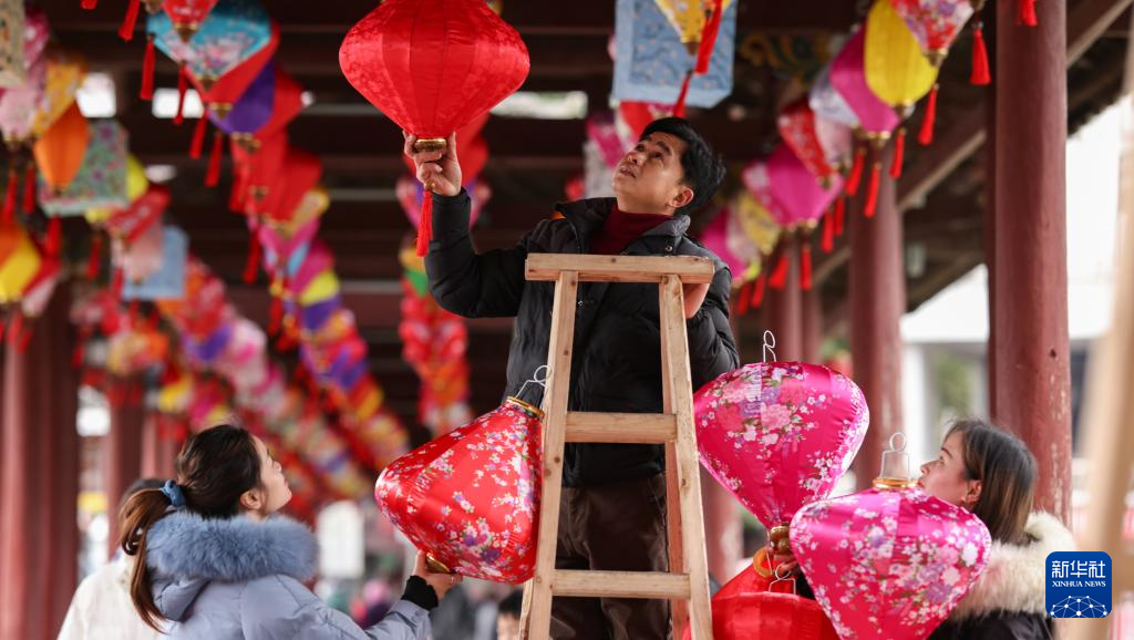 虎年春节前夕,在湖南省怀化市通道侗族自治县,人们纷纷对风雨桥等具有当地特色的场所进行美化装饰,挂上喜庆的花灯,迎接新春佳节来。