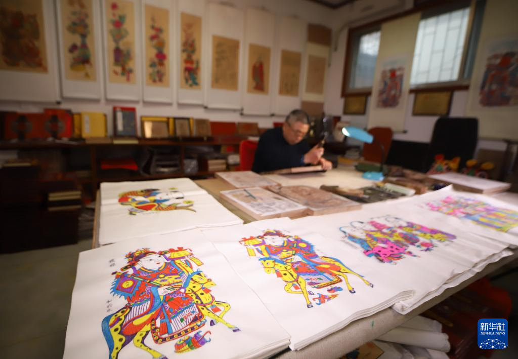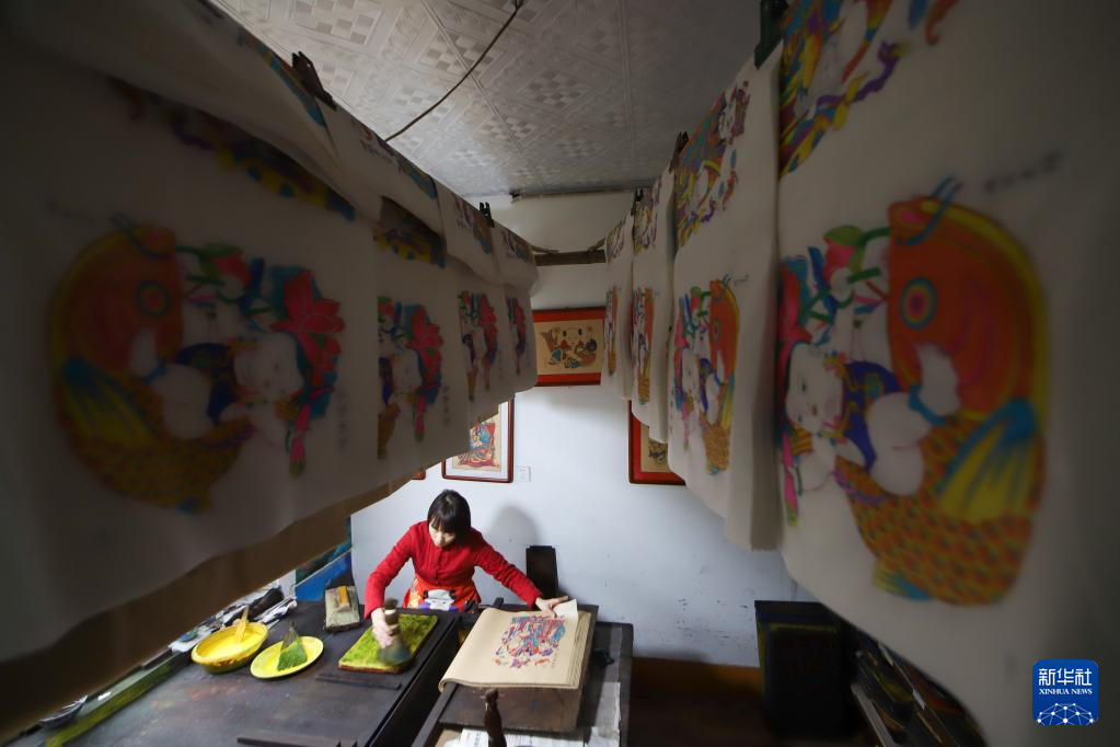 1月25日,山东潍坊年画艺人在印制年画。新华社发(孙树宝摄)
