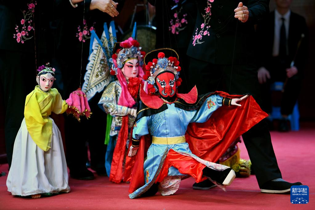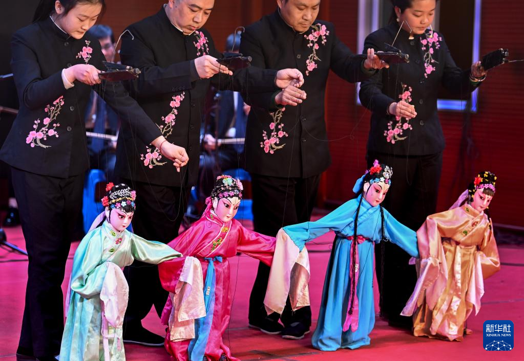 3月4日,在陕西省合阳县文化馆演艺厅内,合阳县线腔木偶剧团的演员为观众表演提线木偶剧《闹春》。