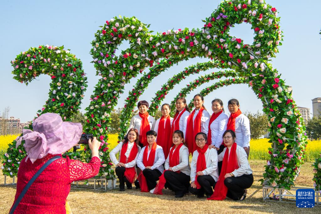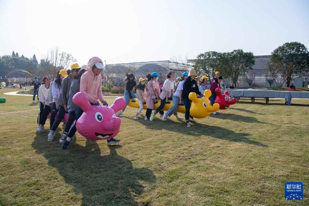 3月8日,游客在位于大足区的天华百卉园草坪上做游戏。