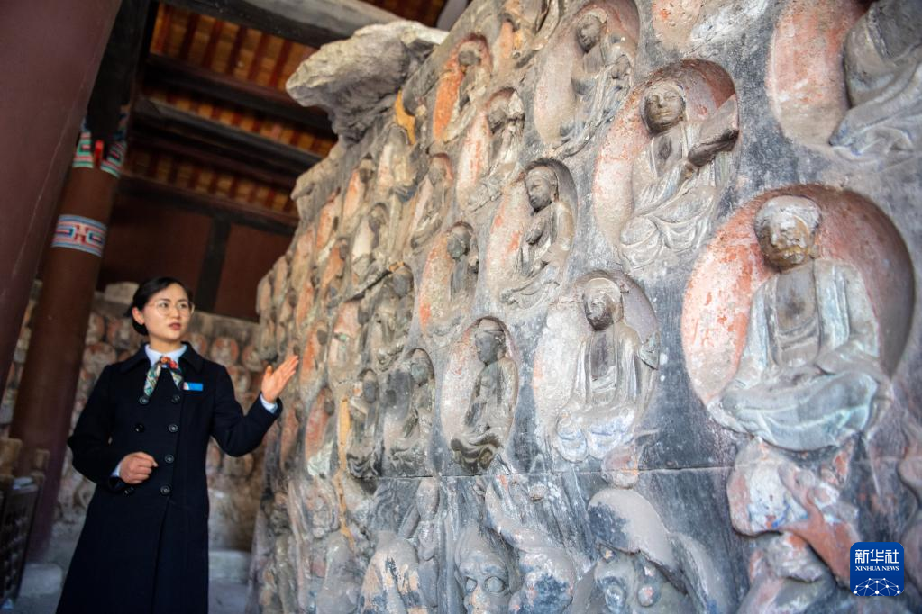 3月7日,工作人员在大足石刻宝顶山景区介绍石刻造像。