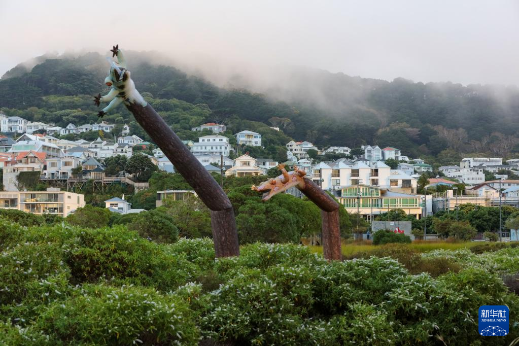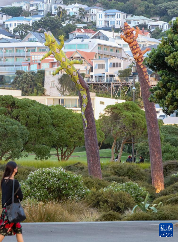 3月9日,新西兰视觉艺术家丽莎·莱哈娜的作品《天空舞者》——6只充气壁虎在新西兰首都惠灵顿市中心展出。