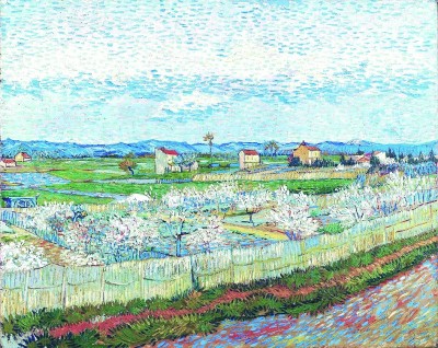 花朵是春天的笑靥。梵·高一生爱画花,除向日葵等瓶花题材外,他还爱画大地上盛放的桃花、梨花、杏花等等。挺拔的梨树昂然伫立,纷繁的花朵在枝头簇拥生发,蓬勃恣意;弯曲伸展的枝条映衬在蓝天之上,纯净的杏花点缀枝头,清旷雅丽……如果说莫奈和毕沙罗的春天是舞动的姑娘,梵·高的春天更像呱呱坠地的新生儿,是响亮的,热烈的,是生命的释放与呼唤。
