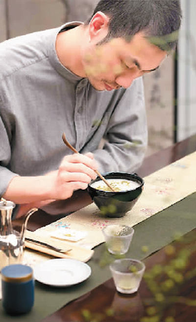 韩喆明是宋代茶文化研究者,擅长茶汤作画技艺。6年间,他在茶汤上勾勒了200多幅画作。许多人通过他的作品开始对宋代茶文化产生兴趣,进而更深入地了解和探究宋代美学、乃至中华文化的精神意趣。