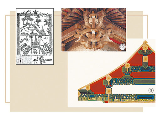 东汉时期,出现了真正的木楼和多层木塔。至晚从隋唐时期开始,以梁柱和“铺作(斗拱)层”相结合的技术,支撑起大开间大进深的建筑屋顶。两宋时期,产生了丁字脊和十字脊屋顶,以及“工”字形和“亚”字形平面的殿堂,挑檐也有所缩小。可以说,我们今天所能见到的传统建筑的基本形式,在宋代均已出现了。