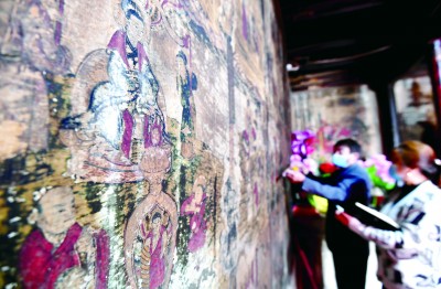 图为日前,文物工作者对涿鹿县五堡镇广恩屯村一处古建筑内的壁画进行勘察。陈晓东摄/光明图片