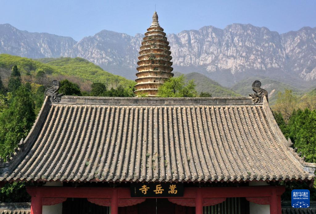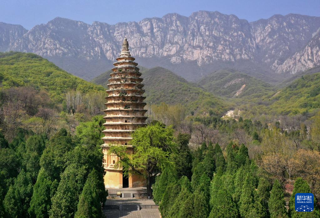 这是登封“天地之中”历史建筑群中的嵩岳寺塔(4月7日摄,无人机照片)。