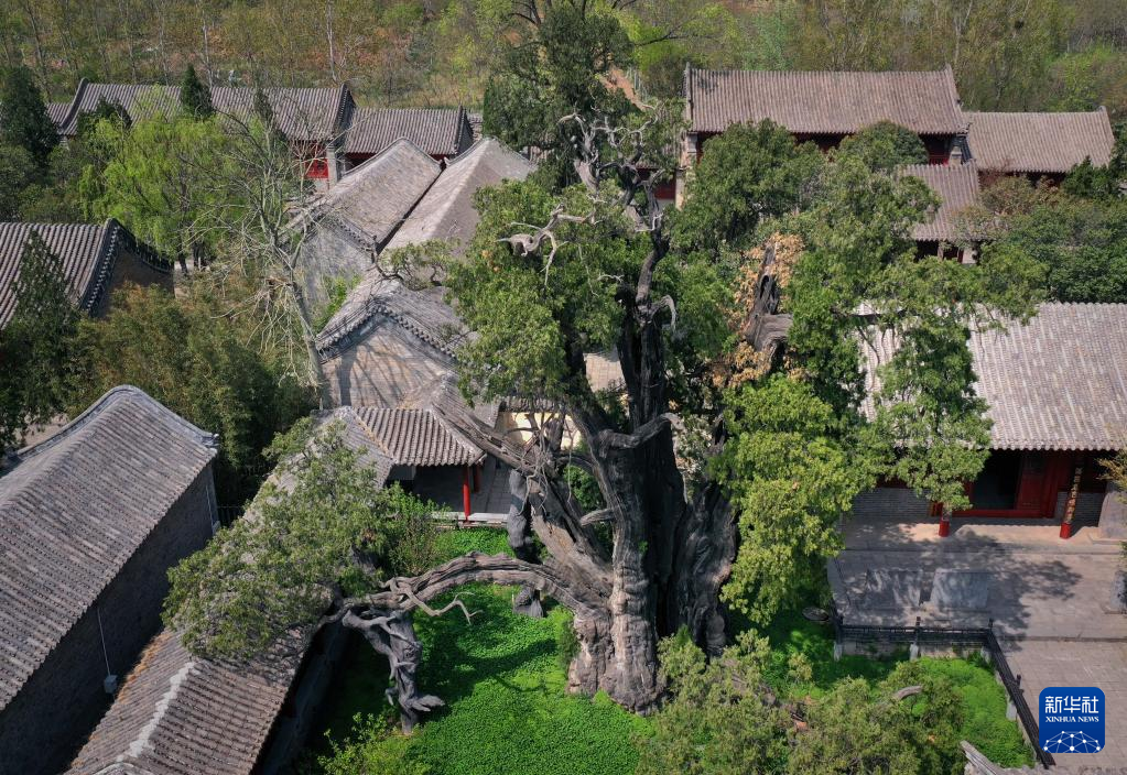 这是登封“天地之中”历史建筑群中嵩阳书院内的“将军柏”(4月7日摄,无人机照片)。