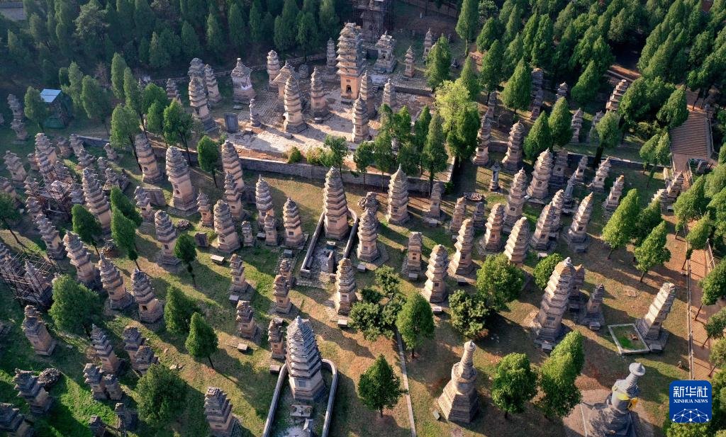 这是登封“天地之中”历史建筑群中的少林寺塔林(4月7日摄,无人机照片)。