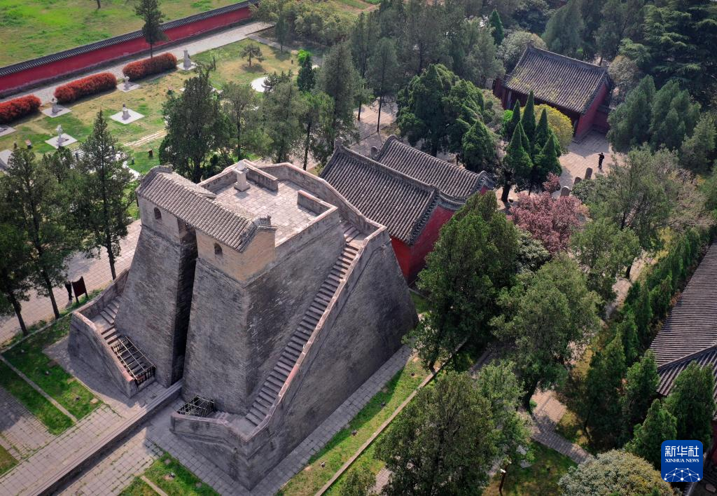 这是登封“天地之中”历史建筑群中的观星台(4月7日摄,无人机照片)。