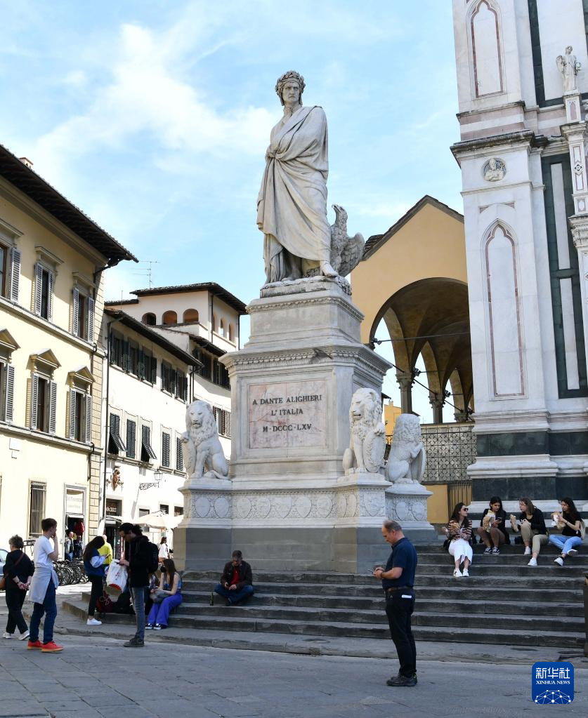 这是4月14日在意大利佛罗伦萨拍摄的但丁故居博物馆外的但丁雕像。