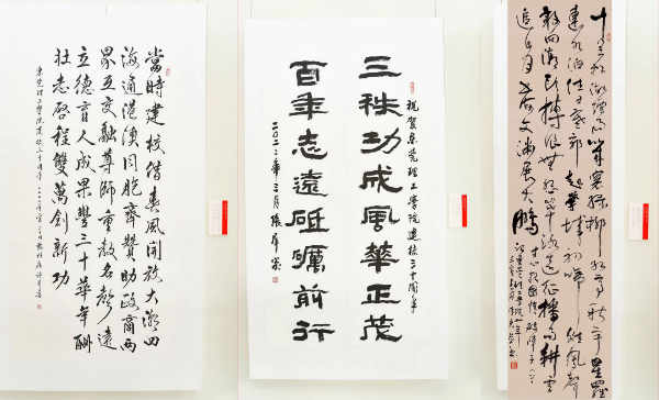 据介绍,本次展览有三个特点:一是展品主题鲜明突出,反映了东莞理工学院建校以来的校风校貌建设,兼具思想性和时代性;二是形式丰富多姿多彩,书法类篆隶楷行草五体皆全,美术类国画油画水粉水彩一应俱全,丰富了展览视觉效果;三是老中青三代同堂,体现了东莞书画界的传承与发展。