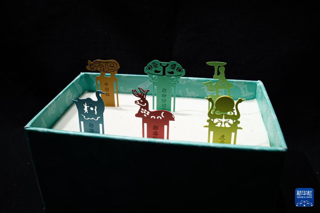 取材于彩漆木雕鸳鸯形盒、彩绘漆木卧鹿、彩绘漆木虎座鸟架鼓(前排从左往右)、牛形钮铜盖鼎、彩绘漆木猪形盒、人骑骆驼铜灯(后排从左往右)等文物制作的文创书签(5月12日摄)。