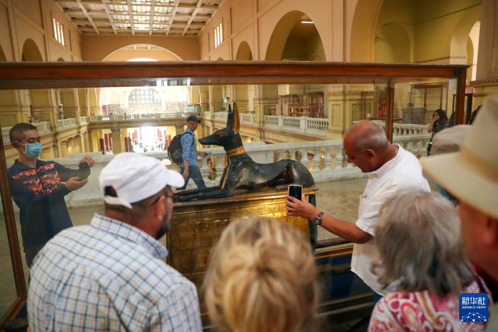 5月14日,在位于埃及开罗的埃及博物馆,游客参观法老图坦卡蒙墓中出土的“阿努比斯”雕像。