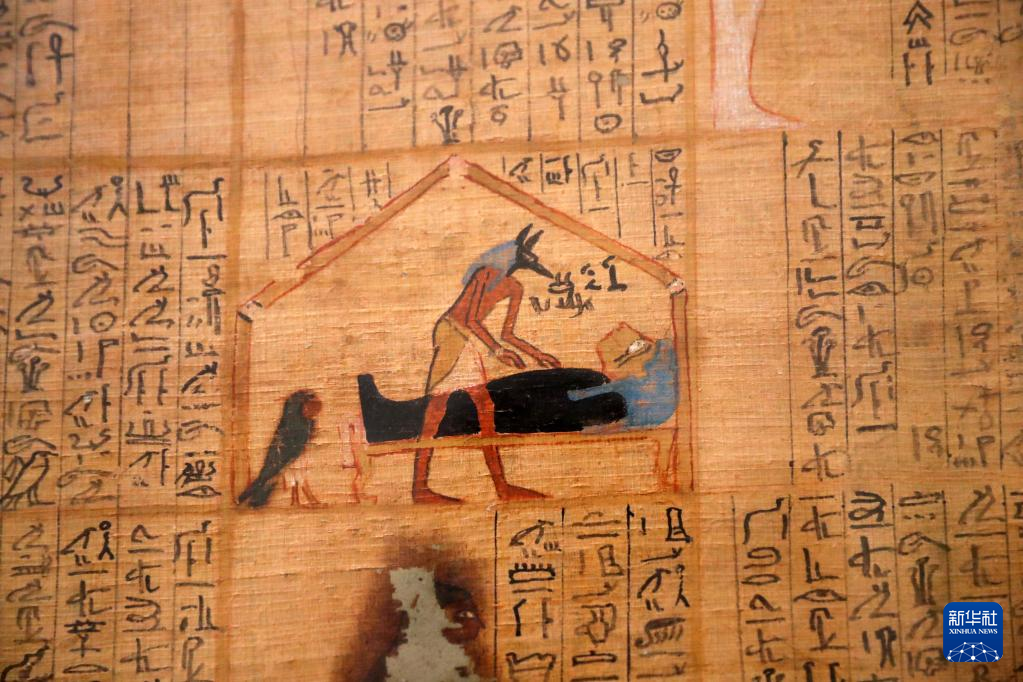 这是5月14日在位于埃及开罗的埃及博物馆拍摄的一幅绘有“阿努比斯”制作木乃伊的莎草画。
