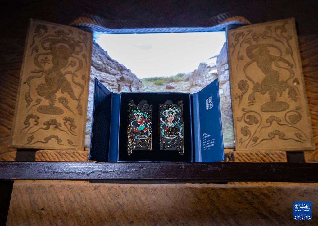 这是5月16日拍摄的宁夏博物馆的文创产品胡旋舞书签套盒(前)与馆藏石刻胡旋舞墓门。