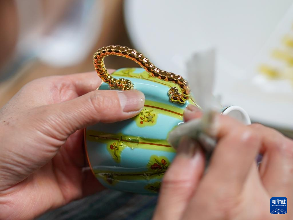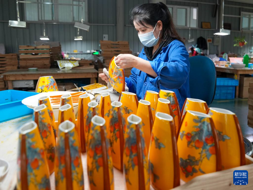 在江苏高淳陶瓷股份有限公司生产车间,工作人员给陶瓷产品贴花(5月12日摄)。