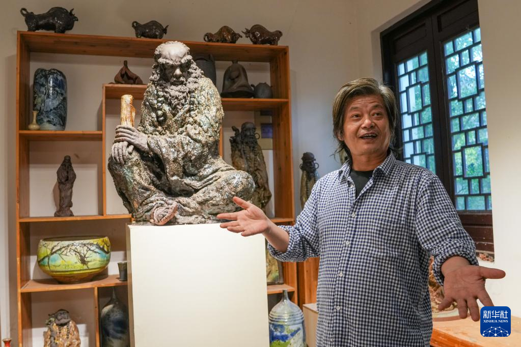 在位于南京高淳的江苏省文艺家创作基地,省级陶瓷艺术大师童定家在工作室内介绍自己的陶艺作品(4月25日摄)。