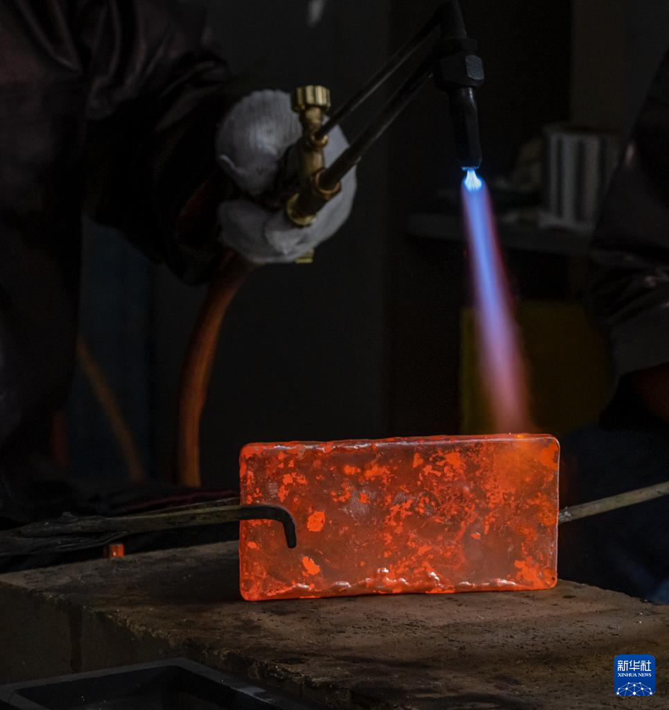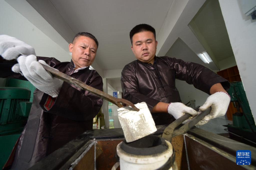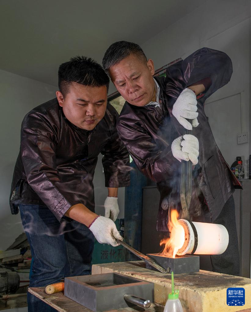 5月21日,邰引岩(左)在剑河县仰阿莎街道川洞村的银饰工坊熔化银块。