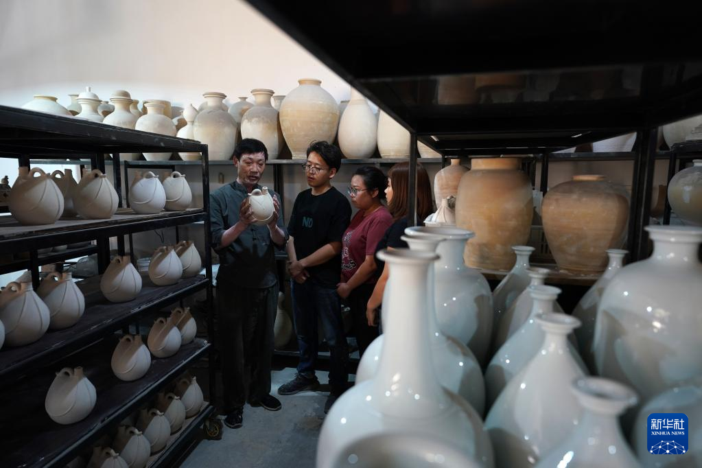 6月5日,在河北省临城县邢窑文化博览园,张志忠(左一)为学生讲解邢窑白瓷知识。