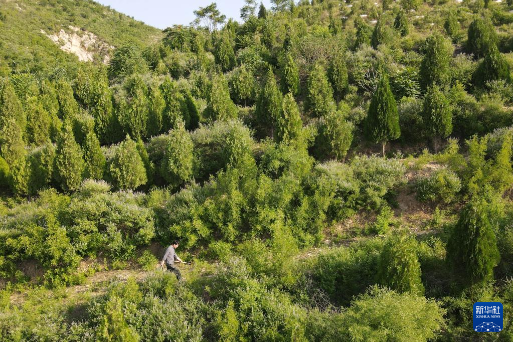 6月5日,在河北省临城县西竖镇山南头村,张志忠在寻找釉土(无人机照片)。