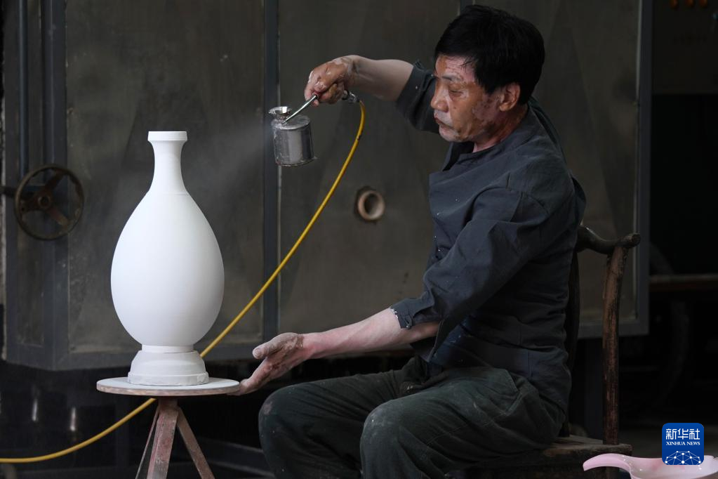 6月5日,在河北省临城县邢窑文化博览园,张志忠为邢窑白瓷施釉。