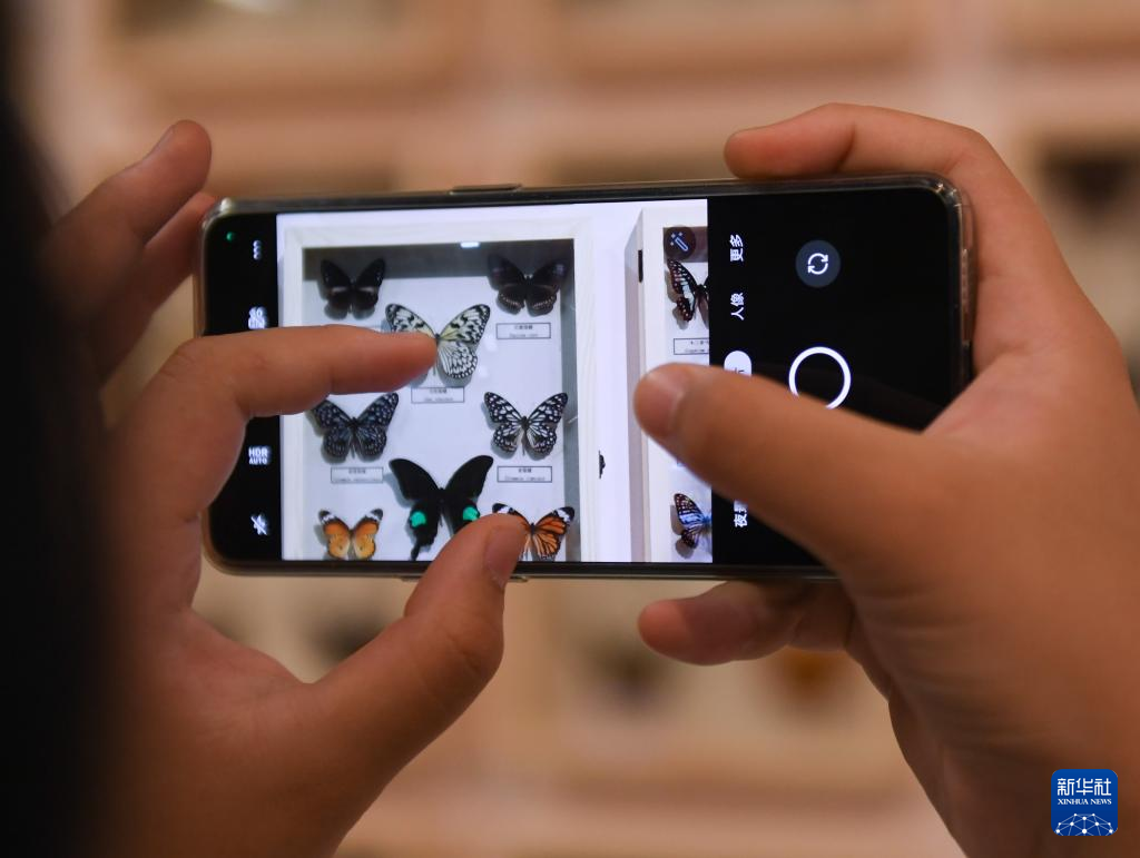 6月9日,一名市民用手机拍摄“24小时博物馆”展示的蝴蝶标本。