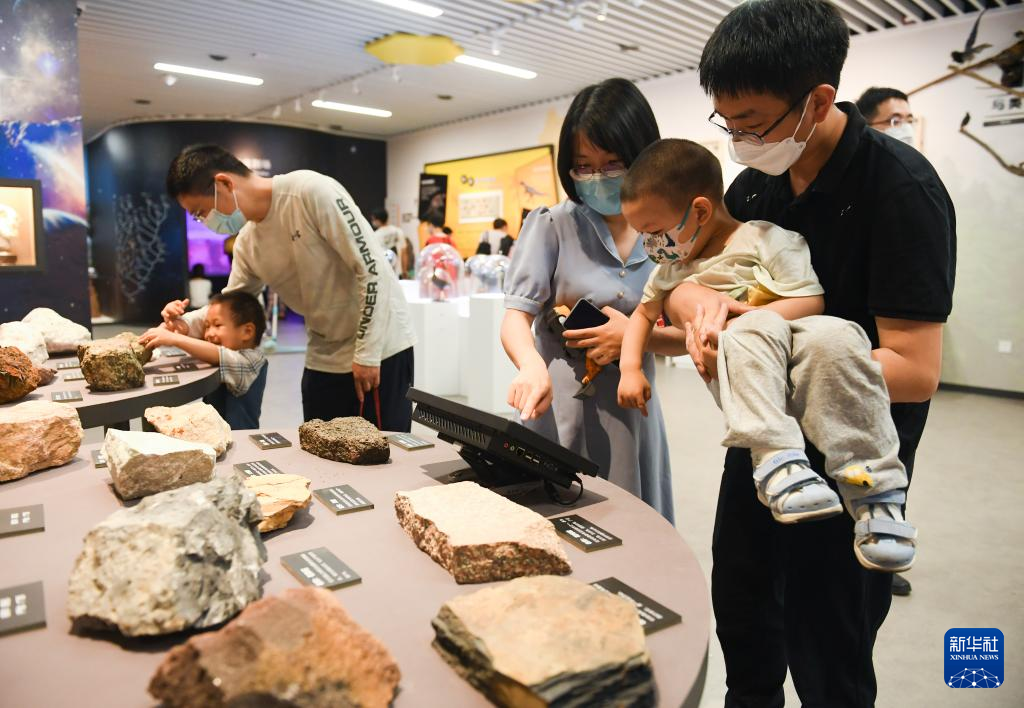 6月9日,家长带着孩子在“24小时博物馆”内参观岩石标本。